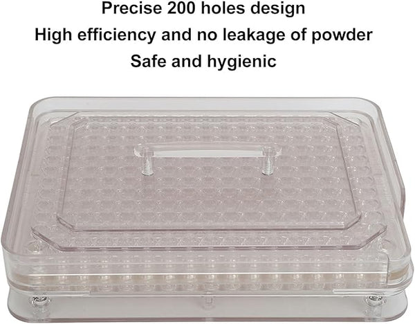 The 200-hole capsule filling machine is a manual, hand-operated tool designed to simultaneously align and fill 200 capsules, greatly increasing efficiency over individual filling. It features a base plate with 200 holes, a cover plate, a powder spreader, and a tamper for compressing powder into capsules. Crafted from food-grade ABS plastic, this machine is ideal for home use, small-scale production, and laboratory settings to produce personalized supplements, vitamins, or herbal formulations.