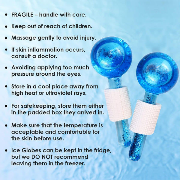 Store Ice Globes in the freezer, refrigerator, ice bowl or cool water. DO NOT put Iced Globes in your freezer compartment. They might break if the temperature is TOO cold. Place in the refrigerator only. Clean Ice Globes with alcohol and dry them before massaging. Excellent for facial and neck massage as well as back, hand, foot, etc.