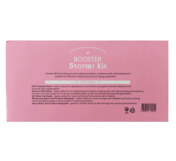 The BB Glow Booster Starter Kit contains all 5 different booster ampoules in one box, Acne, Aqua, Peptide, Salmon DNA and Whitening & Wrinkle. It is very practical, Convenient and cost-effective. Skin Treatment Kit that has different ampoules to address a variety of skin concerns. Serums absorbs into your skin layers to give effective results.