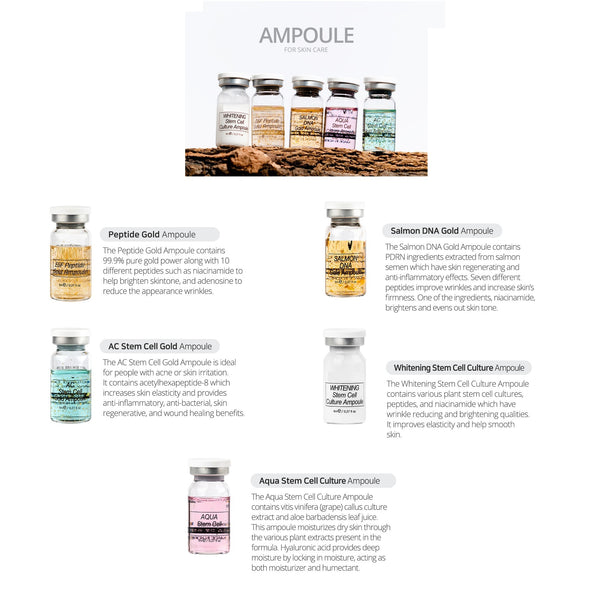 12 Vials (3 x Whitening Stem Cell Ampoules, 3 x Aqua Stem Cell Ampoules, 2 x Salmon DNA Gold Ampoules, 2 x EGF Peptide Gold Ampoules, 2 x Acne Stem Cell)